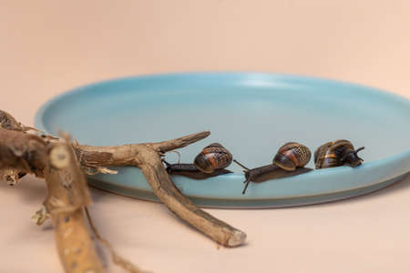 Garden snails crawling on blue plate on beige background. Beautiful shadows and eco driftwood. High quality photo