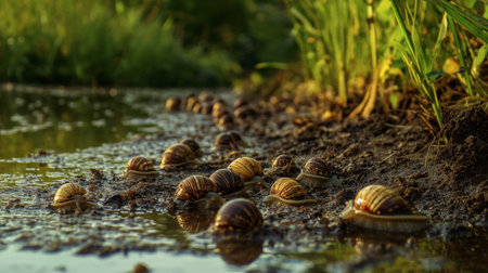A tranquil scene featuring snails slowly crawling over wet soil near a calm water source. The lush green environment enhances the serene ambiance of nature.