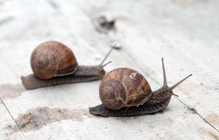 Two snails on a wooden bench in the garden close-up
