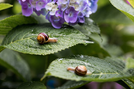 Beautiful nature background and environment. Snails crawl in nature amid heavy rain. Fight with all the problems that come through concept.