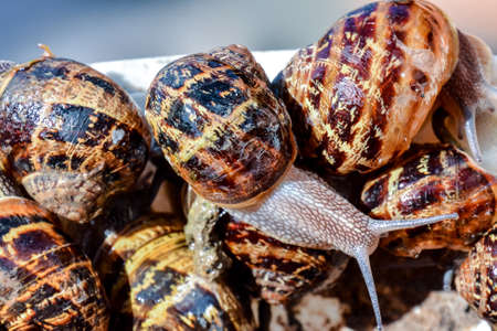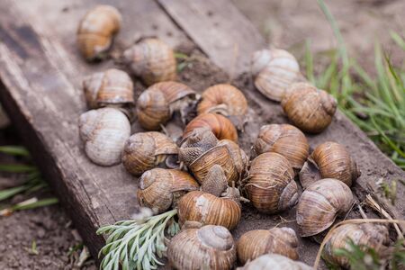 bunch of hand-picked grape snails. Grape snail farm for restaurants. mollusk on wooden plank.
