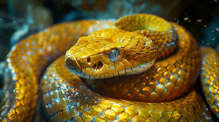 Golden snake with shiny textured scales coiled tightly image, ai generated. Venomous reptilian glossy vibrant appearance photography scene wallpaper. Animal wildlife concept photorealistic photo