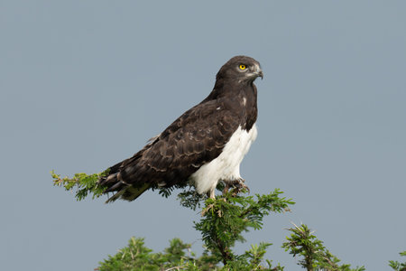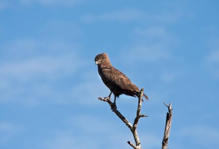 Brown Snake Eagle (Circaetus cinereus) specialist raptor hunts snakes and reptiles is here perched atop candelabra tree (euphorbia ingens) against blue sky looking around for its next prey in Tarangire National Park Tanzania.