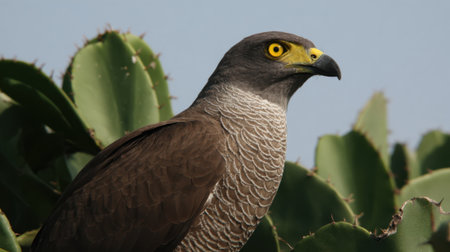 A detailed close-up of a Crested Serpent Eagle with striking yellow eyes and a sharp beak, nestled within the vibrant green foliage of cactus plants.