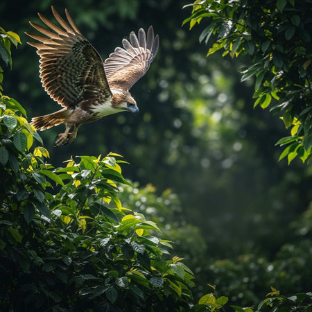 A hawk glides gracefully in a lush green forest, its wings fully spread. Sunlight filters through the trees, creating a magical atmosphere as the bird hunts.