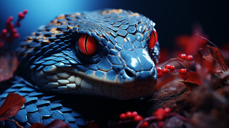 Captivating Image of a Striking Blue Snake with Vivid Red Eyes, Coiled in a Mystical Forest Setting