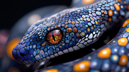 Close up of a vibrant, colorful snake showcasing intricate scales and mesmerizing eyes, perfect for nature photography enthusiasts and wildlife lovers