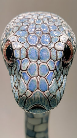 A close up view captures the intricate textures and colors of a snakes head showcasing its striking blue eyes and unique patterns.