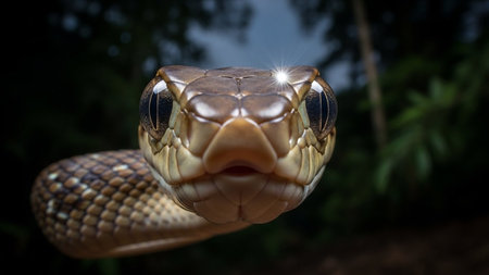 A close-up shot of a cobras head as it prepares to strike, with a focus on its intricate scales and piercing gaze.