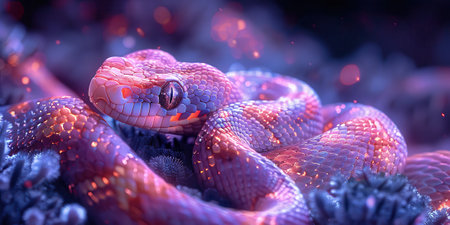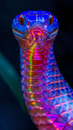 Close-up of a snake's face illuminated by vibrant neon lights, creating a mesmerizing and otherworldly effect