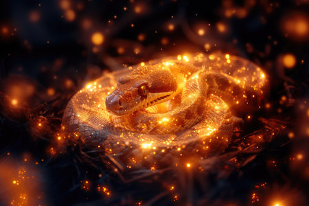 A stunning close-up of a snake's golden scales, artfully illuminated against a dark background, celebrating transformation and Lunar New Year themes