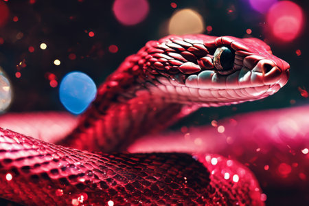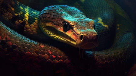 Close-up of a vibrant snake with detailed scales and intense eyes, highlighting its exotic and captivating beauty. High quality photo