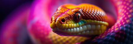Colorful close-up of a snake showcasing vibrant scales and intricate patterns, set against a dark background. Reptile and nature concept.