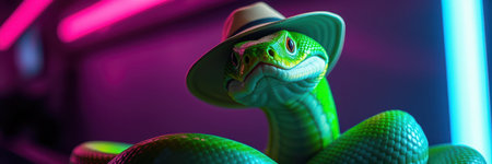 Green snake wearing a hat poses under colorful neon lights in an indoor setting
