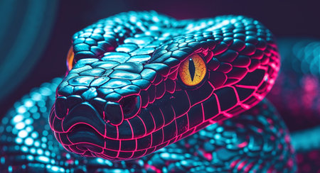 AI Generated. glowing snake with neon scales close up on blurred background technology security concept