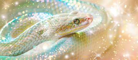 Snake 2025 is the symbol of the coming new year. Beautiful albino.Gorgeous spectacular shiny shiny snake. Dreamy and positive beautiful symbol of the coming new year Greeting holi