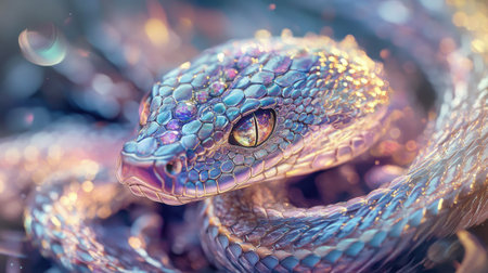 This captivating image showcases a colorful snake with iridescent scales shimmering in soft light. The close-up shot highlights intricate details and stunning textures, making it a perfect representation of wildlife beauty and nature's artistry.