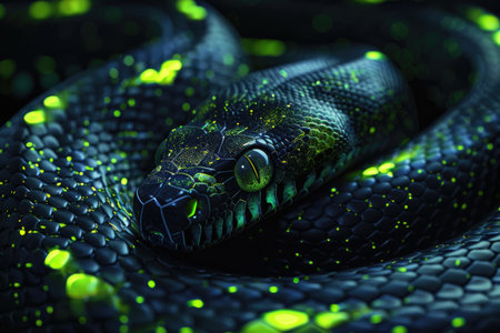 An AI generated illustration of a macro shot of a green-scaled snake
