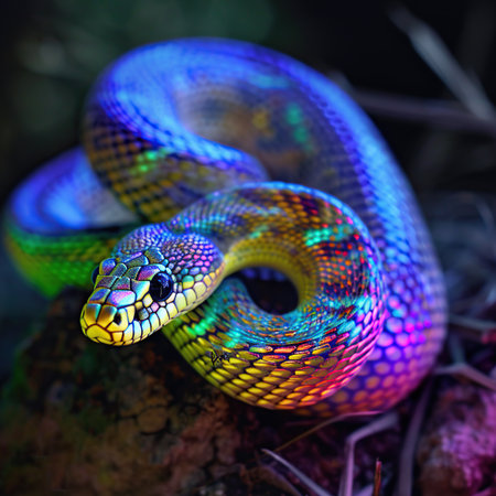Vibrant Close-Up of Iridescent Snake in Kaleidoscopic Bokeh Background