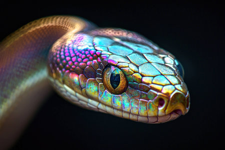 Close-up of a colorful snake with iridescent scales, showcasing intricate patterns and textures against a dark background. Nature and wildlife concept.