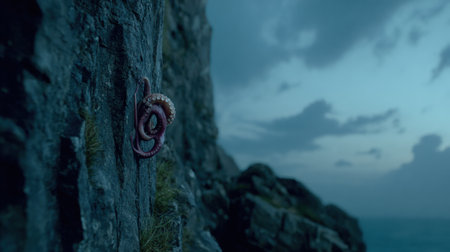 A tentacle rises from a rocky crevice beneath a dark sky, showing natural wonder with waves crashing nearby.