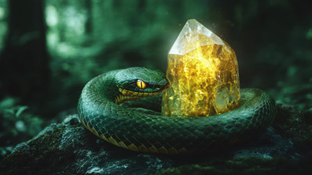 A striking, detailed close-up captures a coiled green snake in dramatic lighting. Its scales are vividly textured and its eyes hold a captivating, intense gaze, showcasing reptilian beauty.