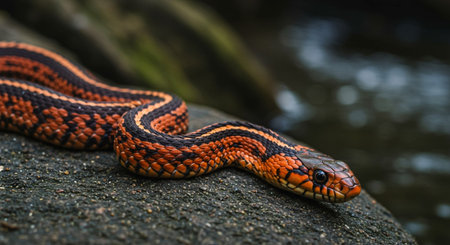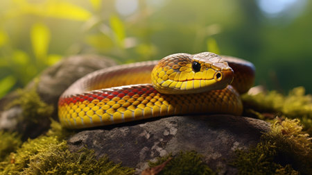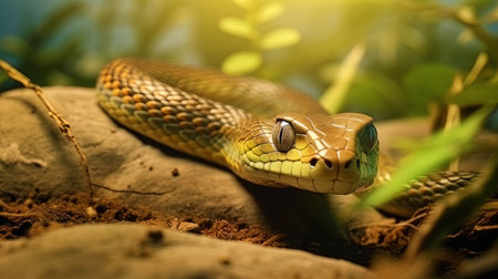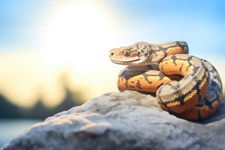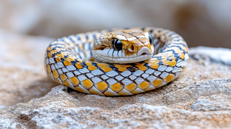 A detailed view of a snake resting on a boulder, showcasing its magnificent scales and unique features, depicting a terrestrial creature from the Colubridae, Python family, and Elapidae group