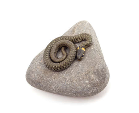 The grass snake Natrix natrix, snake crawls on a hot rock rock.