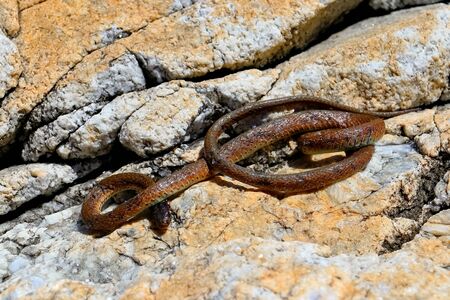 Venomous snake Gloydius ussuriensis on the stone in sunny day closeup. Nakhodka, Far East Russia.