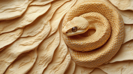A coiled yellow snake sits on a textured sandy background, blending with the environment. The snake is alert, showing its smooth scales under bright daylight.
