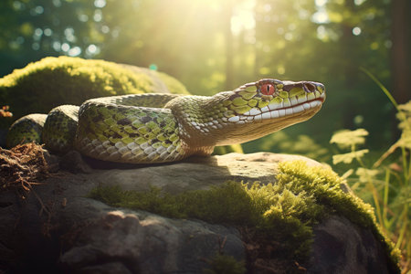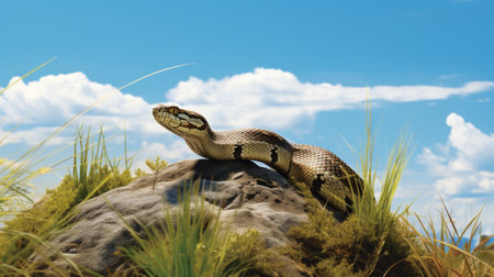 a snake perches on a rock amidst lush grass, against a backdrop of vivid blue skies. this hyper-realistic image captures the essence of a desert landscape, reminiscent of commercial imagery found in national geographic. rendered using maya, this photo showcases the snake's natural habitat with stunning realism. ai generated