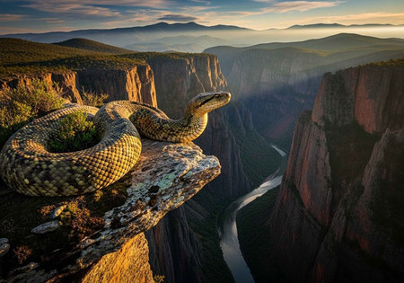 apex predator snake perched on a rocky cliff amidst lush grass, capturing the essence of realistic blue skies and hyper-realistic atmospheres. shot with iso 200, this image showcases the mesmerizing desertwave landscape, while the photo-realistic detailing and texture-rich elements bring the scene to life. ai generated
