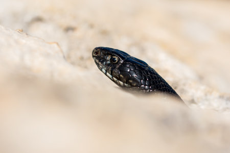 Close up macro shot of the face of an adult Black Western Whip Snake, Hierophis viridiflavus, an endemic snake species in the Maltese Islands.