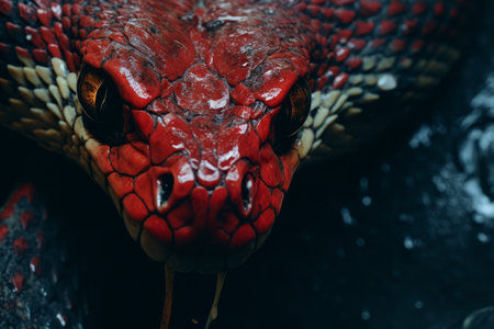 Green viper with tongue out, dark background, macro shot, intense and captivating