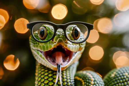 A coiled green snake with bright scales and an open mouth. Glasses are placed on the snakes eyes. Bokeh lights are visible in the background.