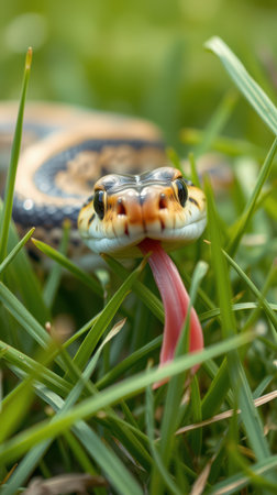 Close-up of a vibrant snake with mouth open showcasing striking details and colors in its habitat