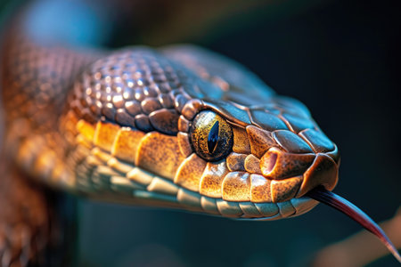 A snake showcases its unique scales and forked tongue in a dramatic low-light environment