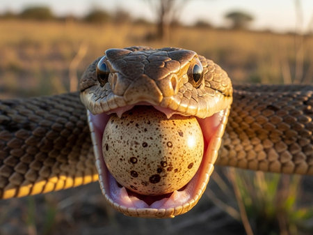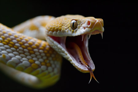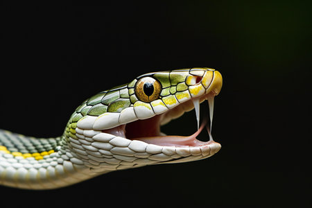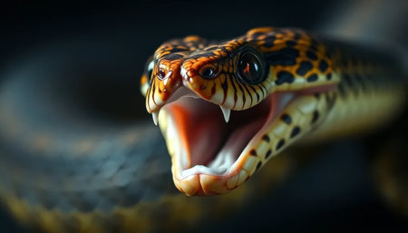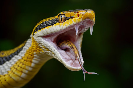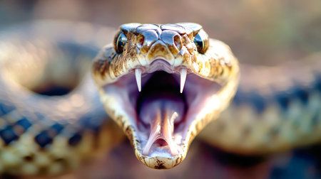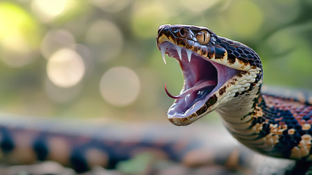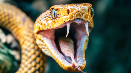 Captivating close-up of a striking snake with an open mouth revealing sharp fangs