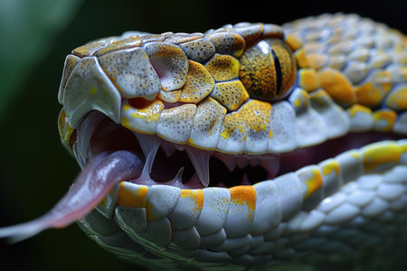 A striking serpent opens its mouth wide, revealing venomous fangs ready to strike. Vibrant colors contrast against the dark backdrop of a dense tropical setting, enhancing its predatory beauty.