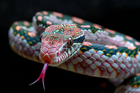 Brightly colored snake displays vibrant scales and intricate patterns close-up