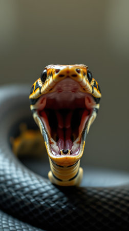 Close up of snake's head with it's mouth open. Generative AI.