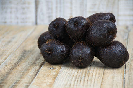 Salak fruit or snake fruits on the wooden table in the sunlight.