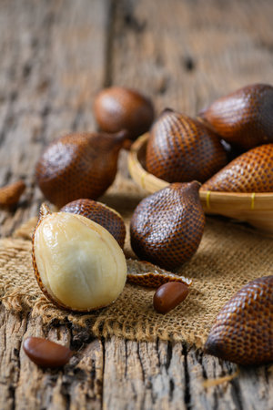 Thailand fruit, Red Fruit Salacca, salak on wooden table.