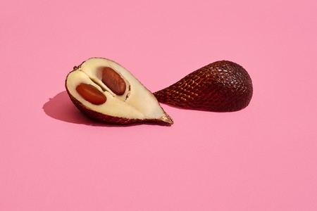 Close up high quality image of cutted salacca halves, fruit composition on pink pastel
