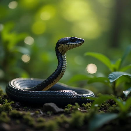 Black snake with yellow underside coils on the forest floor, lifting its head amidst lush green plants, ideal for wildlife or nature content.