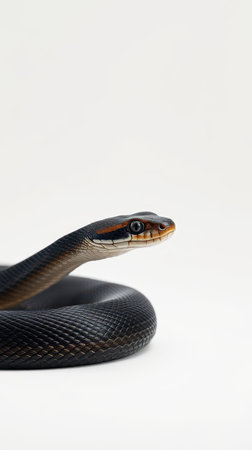 Black snake with distinctive markings gracefully posed on white background