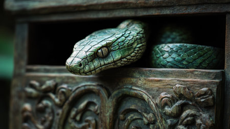 Mystical green wooden snake with glowing eyes, creating a sense of mystery.