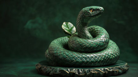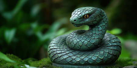 A coiled green snake with intricate scales, resting among lush green foliage. Its vivid colors blend seamlessly with its natural surroundings, creating a striking and lifelike scene.
