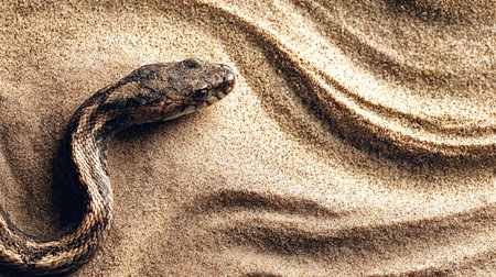 Brown snake is slithering across a smooth sandy surface, leaving a wavy pattern in its wake, creating a captivating contrast between the reptile and its environment