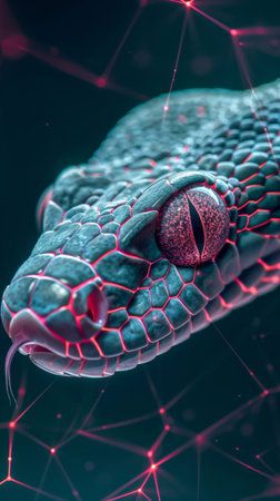 Magnificent Closeup of a Vibrantly Colored Snake Head with Striking Red Eyes on a Dark Background